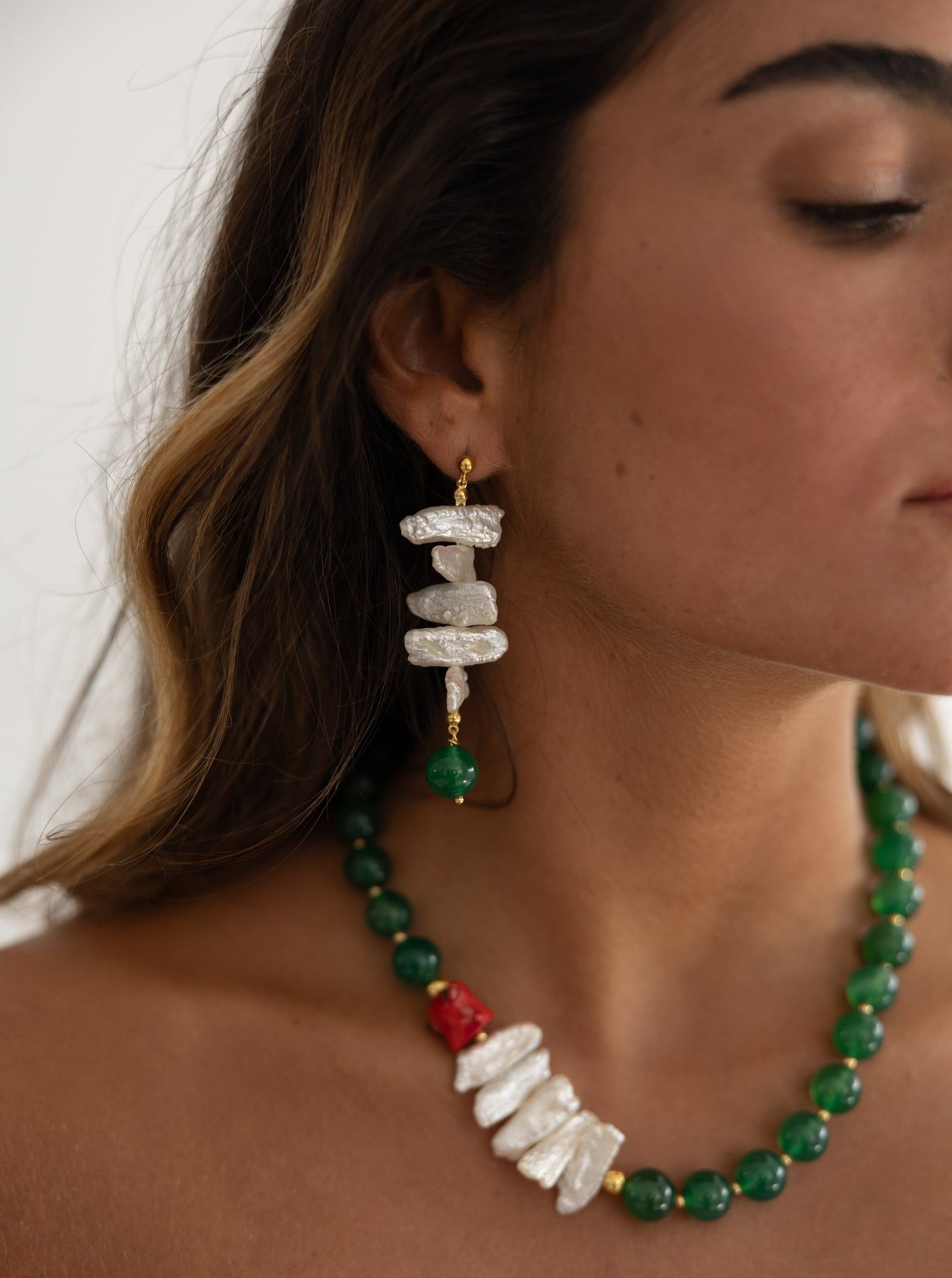 Material: Green agate stones with golden inserts in stainless steel. Egyptian coral and natural freshwater pearls. Stainless steel clasp.