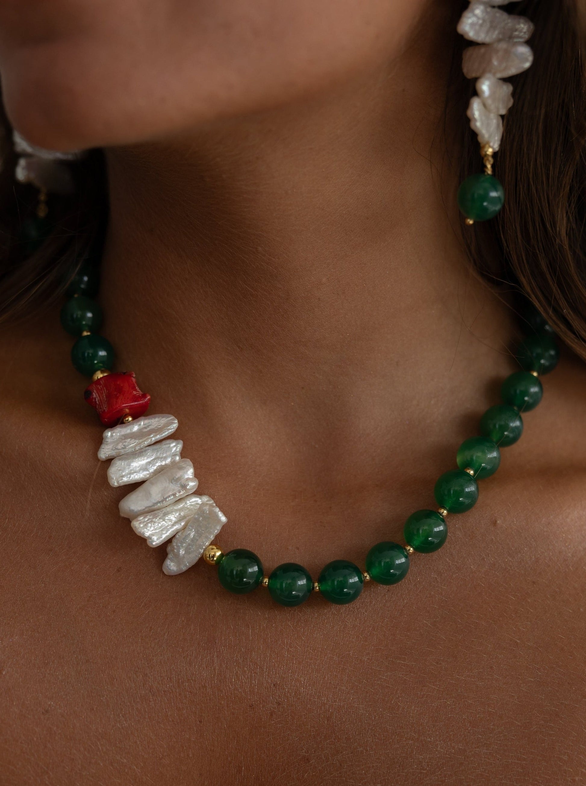 Necklace made of natural green agate stones with golden inlays. Detail with natural red coral and natural freshwater pearls.